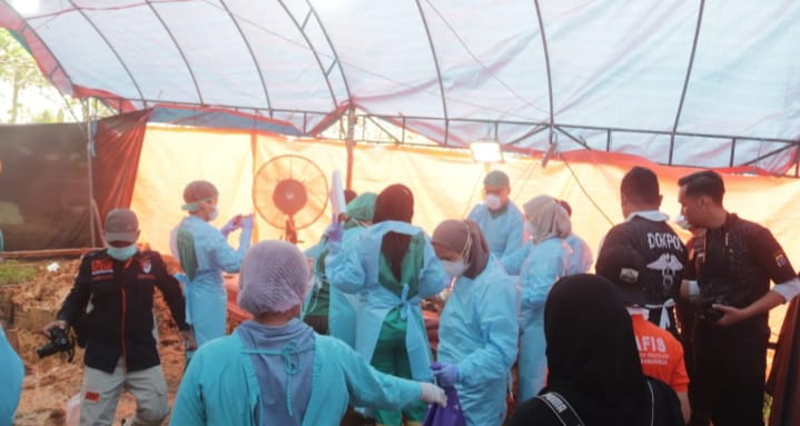 Puluhan personil Dinas Pemadam Kebakaran dan Penyelamatan Kabupaten Kukar dibantu puluhan petugas pemadam kebakaran gabungan dikerahkan, berjibaku memadamkan kobaran api.